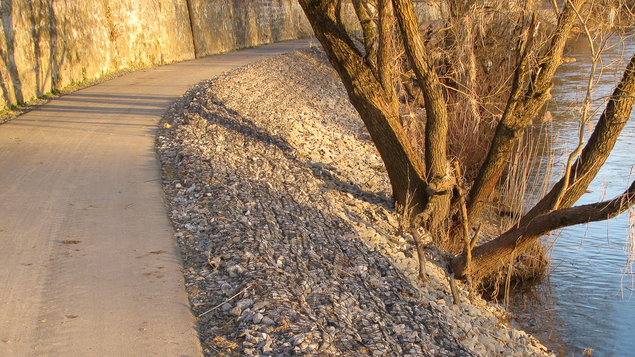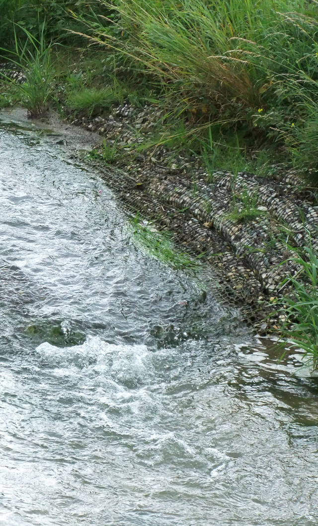 In Abschnitten, wo aufgrund des starken Schiffsverkehrs auf rein technische Lösungen vertraut wird, bilden Röhricht-Gabionen in weniger beanspruchten Aufweitungen eine ökologisch wertvolle Kontaktzone zwischen Land und Wasser.