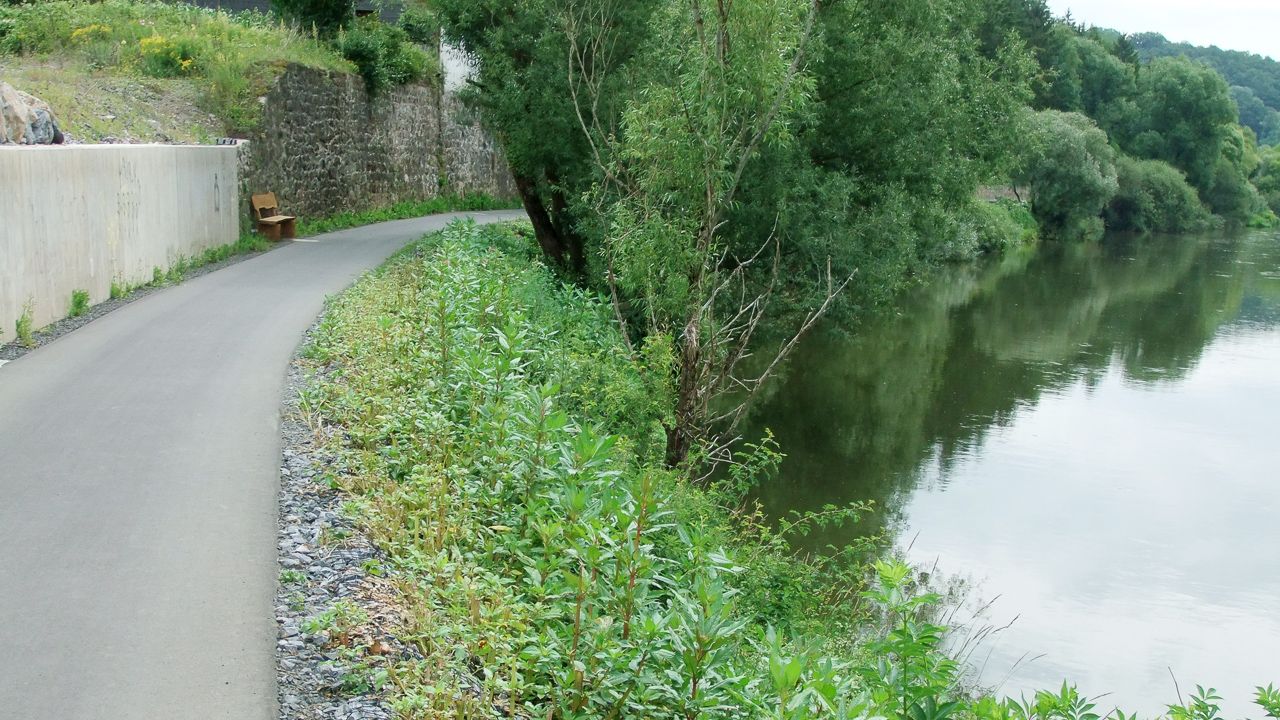 Die Fotos zeigen das Ufer im Bau und im Sommer des folgenden Jahres. Die standortgerechte Ruderalflora konnte im Schutz der Steinmatratzen keimen und leitet eine sukzessive Begrünung ein. An einigen Stellen wächst das unerwünschte Indische Springkraut (Impatiens glandulifera), das als Neophyt in mitteleuropäischen Flüssen schwer verdrängbar ist.
