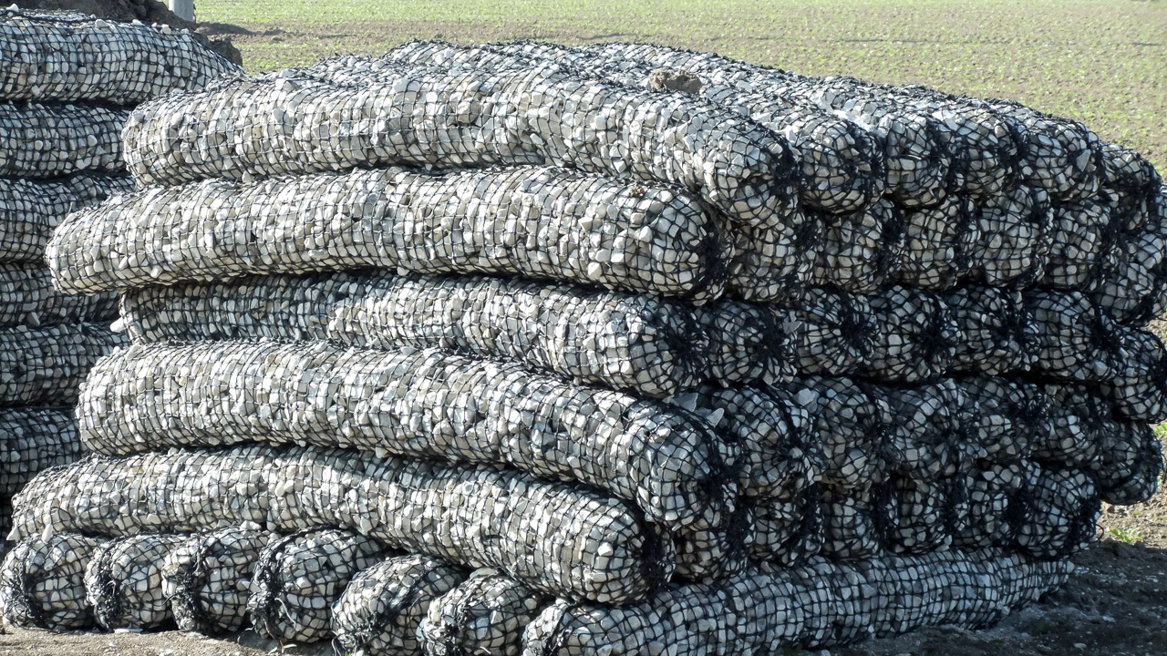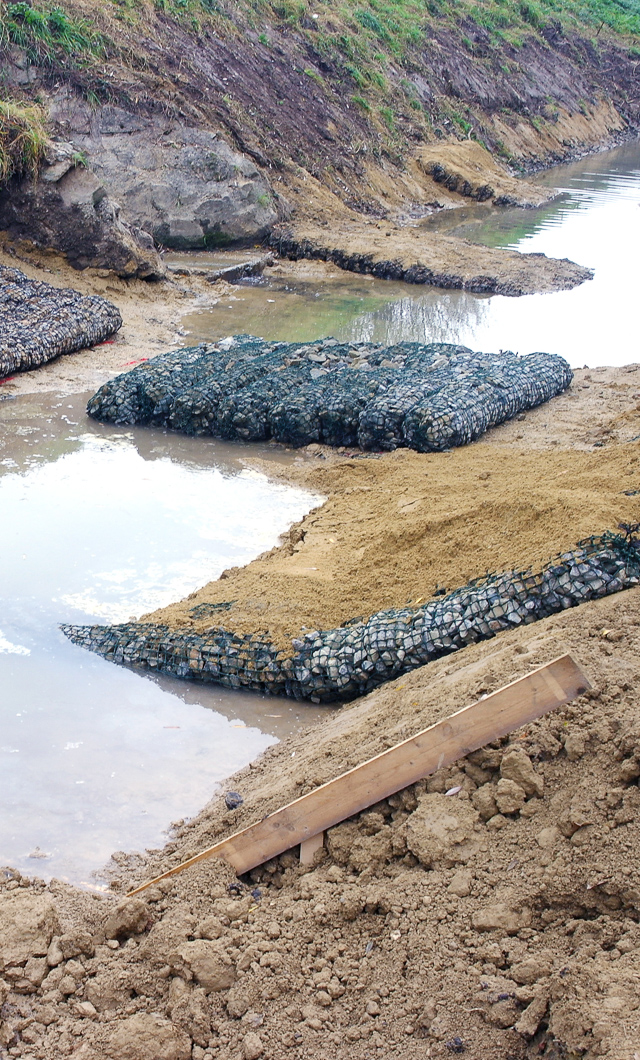Steinmatratzen ersetzen leichte Deckwerke und werden häufig in Verbindung mit Röhrichtmatten verwendet.